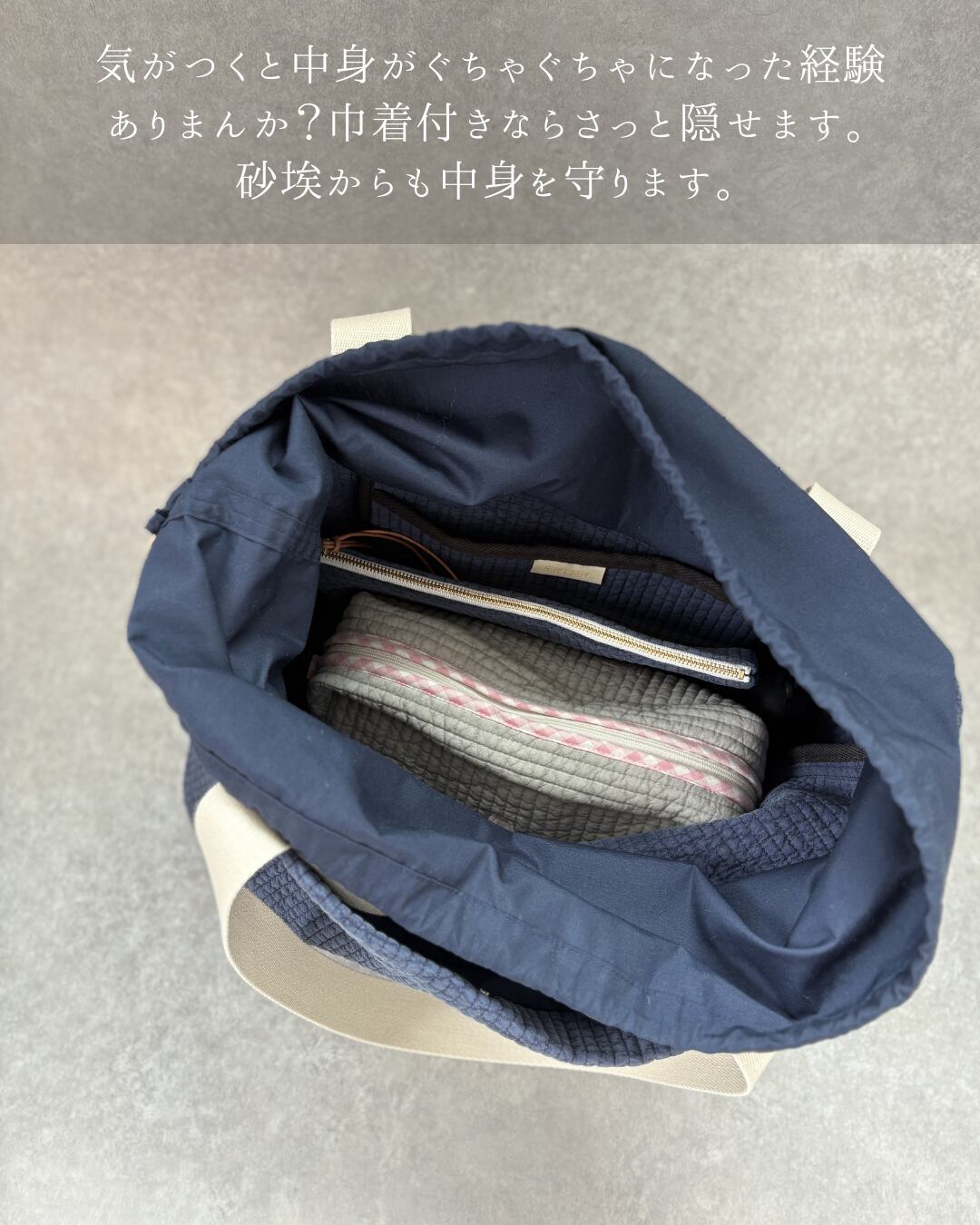 こちらは「入り口巾着仕様」で、毎日の使いやすさと安心感をプラスしました。