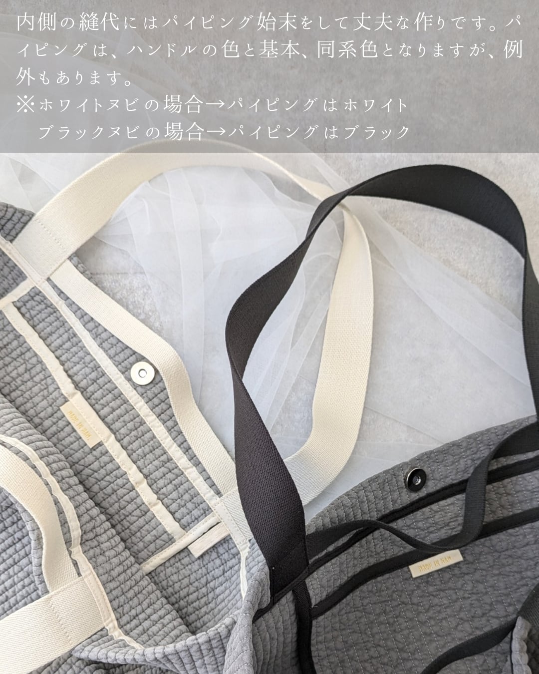 ※内側の縫い代処理のパイピングテープは、基本ハンドルと同色ですがヌビ本体が黒や白の場合は、本体と同色になります。