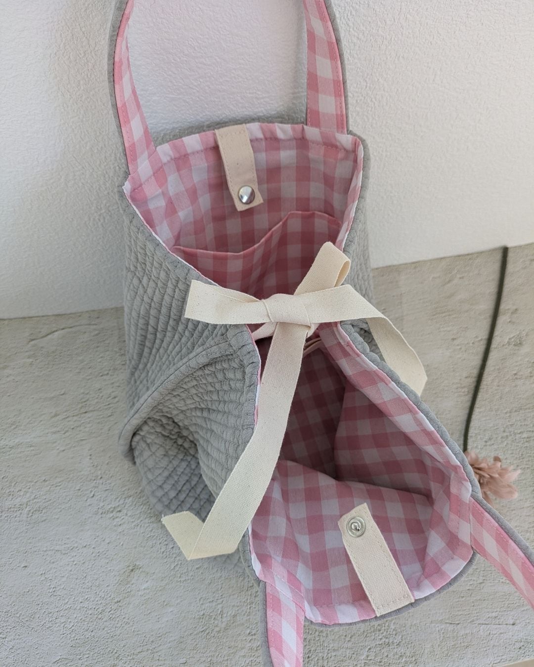 サイドリボンを結ぶと、コンパクトサイズ(巾着型)に変身します